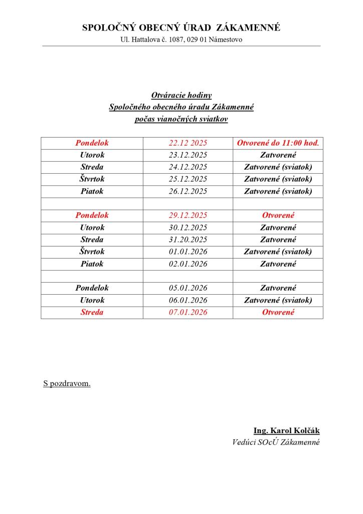 Otváracie hodiny počas vianočných sviatkov - Stavebný úrad