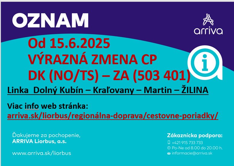 Jedná sa o výraznú zmenu hlavne na linke 503401 (Dolný Kubín – Martin – Žilina), kde od tohto dátumu nebudú premávať autobusy Arriva Liorbus medzi Martinom a Žilinou.